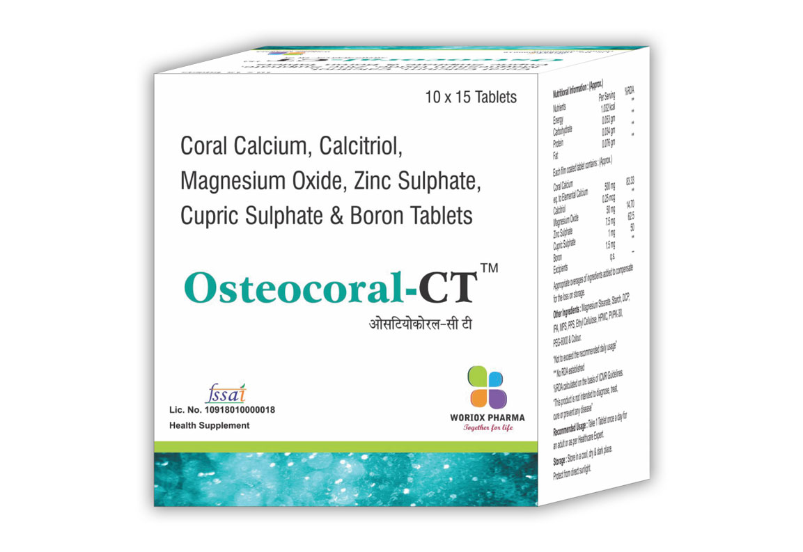 Coral Calcium equivalent to Elemental Calcium 500 mg+Calcitriol 0.25mcg+Magnesium Oxide 50mg+ Zinc Sulphate 7.5mg+cupric Sulphate 1mg+boron 105mg.
