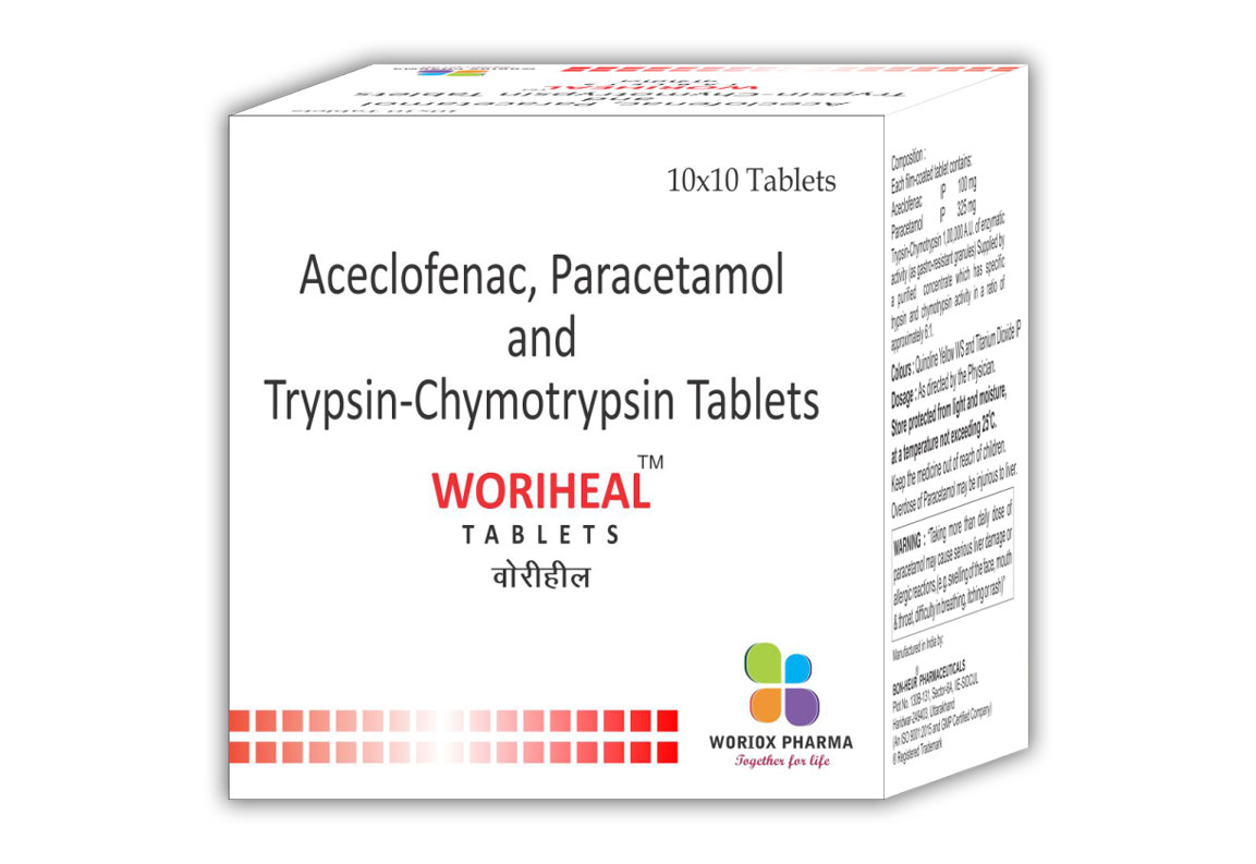 Aceclofenac 100mg+Paracetamonl 325mg+Trypsin-Chymotrypsin 1,00,000 A.U.